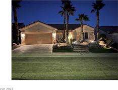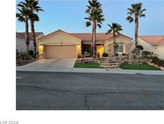 Located in the Sun City Summerlin master planned golf course community this elevated lot provides spectacular City views from front and back. 24 hr security patrol. Property has water smart landscaping with custom raised putting green and chipping and areas. Community pool, gym, tennis/pickleball, softball field, theater, dining, activities, classes, etc. 4 community centers within 1 square mile and Highland Falls and Palm Valley golf courses within minutes. Brand new carpet in bedrooms! Custom textured concrete and flagstone walkways & sitting areas. Covered patios front & back, 2 car garage with full height storage cabinets. Interior immaculate with custom tile floors & kitchen backsplash, solid countertops, window treatments, large walk in closet in primary suite, wall coverings, mirrored wardrobe doors, Water softener, hot water circulation for quick temp & Osmosis system at kitchen sink. Security gate at entry door. Insulated garage door. New rain gutters front & back.