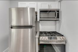 The modern kitchen boasts new stainless steel appliances, including a refrigerator, stove, and microwave. It also features granite countertops, ample cabinet space, and a stylish tile backsplash, making it a perfect place to prepare meals.