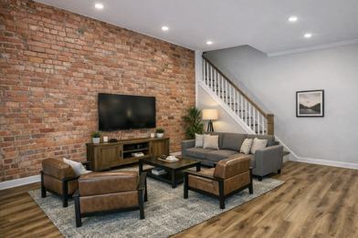 Open‑concept living room and kitchen with beautiful flooring and exposed brick. Modern kitchen features granite peninsula, stainless steel appliances, gray shaker cabinets, matching backsplash, extra counter space, and a rear door to the deck and backyard. Half bathroom on this level.