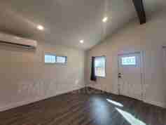 The interior has been completely renovated with updated flooring, fresh paint, and contemporary fixtures throughout. The open living space feels bright and inviting with plenty of natural light. The elevated loft bed creates a separate sleeping area while leaving the main floor open for a living room, workspace, or dining area.
