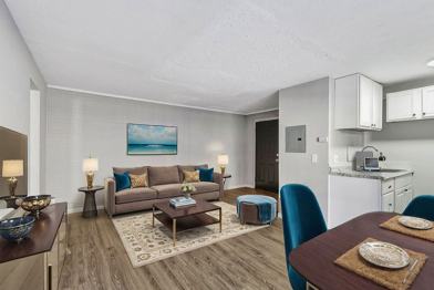 The apartment includes an open living area with a full kitchen equipped with stove, refrigerator, range, and dishwasher, offering ample space for cooking and storage. Additional amenities include patios or balconies, on-site coin laundry, off-street parking, and 24-hour emergency maintenance for added convenience.