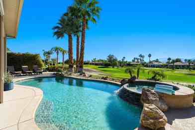 New Listing! Executive Mira Vista Golf Course Retreat Located on the 16th fairway of the Gary Player Signature Course in Mission Hills, this stunning executive retreat offers sweeping golf course and mountain views along with a private sparkling pool and spa designed for luxury and comfort. Recently remodeled, the home features three en-suite bedrooms, including a detached casita complete with kitchenette and private bathroom. The primary and second bedrooms offer king-size beds, while the third bedroom features a queen bed. A dedicated office or optional fourth bedroom includes its own en-suite bathroom and a queen Murphy bed, providing flexible space for additional guests. Inside, soaring ceilings create a light and bright atmosphere throughout the home. Elegant wood-look tile flooring, a cozy fireplace, and expansive windows showcase the beautiful views. Outdoor living is just as impressive. Relax beneath the large covered lanai featuring a comfortable sofa lounge and dining area overlooking the fairway. The spectacular front courtyard offers another private space perfect for morning coffee or brunch. This home sits on a large private lot within the guard-gated Mira Vista community, surrounded by majestic palm trees. The remodeled kitchen features granite countertops, an island, and a wet bar, making it perfect for entertaining. Golf lovers will appreciate pay-as-you-play access to two nearby public courses, the Gary Player Signature Course and the Pete Dye Course, located just around the corner at the Westin Resort and Spa. Other nearby country clubs offer seasonal memberships. Enjoy a short drive to the famous El Paseo shopping and dining district, vibrant Palm Springs nightlife only 9 miles away, and Agua Caliente Casino just 5 minutes away. Take in majestic mountain and golf course views from the living room, dining area, kitchen, and primary bedroom. You may never want to leave this beautiful home on Via Bella, which means ''beautiful street'' in Spanish.
