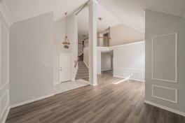 Exceptional property, which offers a perfect blend of luxury and functional design. As you step into the home, the soaring vaulted ceilings immediately enhance the entry with an abundance of height and natural light. The interior features custom trim throughout and premium luxury vinyl plank flooring. The home is designed with a spacious open-concept layout, complemented by granite countertops in the kitchen and all bathrooms. The kitchen is a chef’s dream, equipped with a double oven and a built-in wine cooler.