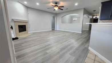 Bright and inviting, the interior boasts light gray walls with crisp white trim and abundant natural light throughout. The spacious living room is perfect for everyday living, highlighted by a cozy corner fireplace, ceiling fan, and views of the covered patio and backyard.