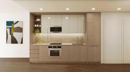 Convertible 2 bedroom layout featuring expansive 10.5-foot ceilings and oversized windows that fill the residence with natural light. Modern gourmet kitchen designed with custom duo-tone cabinetry, travertine stone countertops, full-height backsplash, and a premium appliance suite including Beko and Bertazzoni appliances. Residence also includes in-unit washer and dryer, central air conditioning, and elegant modern finishes throughout. Flexible layout allows for an easy conversion into a second bedroom while maintaining a comfortable living space.