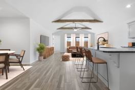 The Providence floor plan features a large open kitchen, dining, and living area that serves as the heart of the home, allowing natural light to fill the space and creating an inviting atmosphere for relaxing or entertaining.