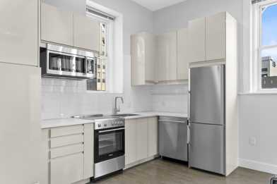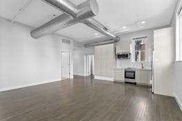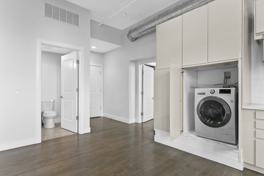 Our two bedroom, two full bath apartment is complete with 15 foot ceilings, over sized windows with custom window treatments, historic hardwood floors with beautiful dark stain, Blomberg stainless steel range, refrigerator, dishwasher and microwave, in unit washer/dryer, and abundant storage.