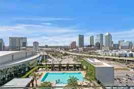 Floor-to-ceiling windows frame sweeping panoramic views of Tampa Bay and the downtown skyline, while sliding glass