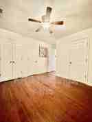 Upstairs, the primary suite features hardwood floors, a ceiling fan, and a private en-suite bathroom with dual vanity and glass-enclosed shower. A second upper-level bedroom is bright and comfortable and also has access to its own full bathroom. A convenient laundry closet with full-size washer and dryer is located on this level.