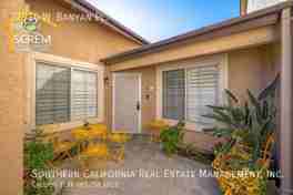 Beautifully updated three-bedroom, two-bathroom single-story townhome in the desirable Mountain View Courtyard. The spacious living room features vaulted ceilings, elegant shutters, an updated light fixture, and a cozy fireplace. The dining area is filled with natural light from charming bay windows and is accented by wood flooring and a modern light fixture. The bright and cozy kitchen features high ceilings, a ceiling fan, a charming bay window with a built-in window seat, and essential stainless steel appliances, including a gas stove, single oven, microwave, dishwasher, and refrigerator. A door from the kitchen leads directly to the private backyard featuring an in-ground spa, ideal for relaxing evenings. The primary suite offers vaulted ceilings, new carpet, shutters, a ceiling fan, and a spacious mirrored closet. The attached bathroom includes a walk-in shower for added convenience. Two additional guest bedrooms and a full guest bathroom. Additional highlights include a two-car garage with a full-size washer and dryer, as well as an additional refrigerator. Enjoy the HOA pool and playground. *Owner may consider a small pet.