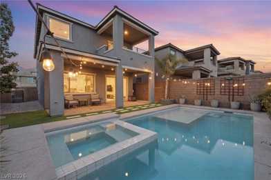 Luxury saltwater pool home in the gated Stonebridge Summerlin community of Bristle Vale just in time for pool season! Elevated lot with beautiful city views and resort-style backyard featuring a large saltwater pool and spa with swim deck, perfect for in-pool loungers, perimeter bench seating, and smart AquaLink system. Full-length covered patio perfect for outdoor entertaining with gas BBQ stub. Spacious 4-bedroom home plus loft with high ceilings and modern finishes throughout. Gourmet kitchen with waterfall-edge quartz island, double ovens, and separate cooktop. Primary suite features a private balcony overlooking the city. EV charger in garage and new washer & dryer included. Located near top shopping, dining, Red Rock Casino, and Red Rock Canyon. Adjacent to the prestigious Doral Academy Red Rock campus. Weekly pool service and monthly landscape service included in rent! Sewer & Trash also included. Apply now for the benefit of an entire pool season!