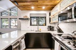 Inside, the cabin has been thoughtfully remodeled to combine modern style with cozy mountain character. The open-concept living area features durable wood-style tile flooring, high-end furnishings, and a stunning, fully equipped kitchen perfect for everyday living or entertaining. Large windows frame picturesque views of the creek, while the inviting fireplace creates a warm and relaxing space to unwind during cool mountain evenings.