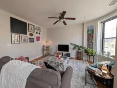 This apartment features hardwood flooring throughout, central air conditioning, high ceilings, a stunning floor open concept floor plan with large windows and lots of natural light. There is a remodeled kitchen with a breakfast bar and pendant lighting, and appliances include a full-size dishwasher, range/stove, fridge, and a built-in microwave. There are two medium sized bedrooms with large double size closets, and the bathroom is fully remodeled. There is ample closet space throughout, and the tenants are responsible for all utilities, including water/sewer.