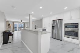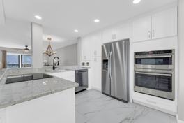 Welcome to this condo w/ stunning pond and lake views. Upon entering, you are greeted by a gorgeous, custom-designed open kitchen that is truly a chef's dream. It features an abundance of new cabinets with pullout drawers, beautiful quartz countertops, and newer appliances, including a built-in wall oven and microwave with convection features and a cooktop range. The interior boasts beautiful oversized porcelain tiles throughout and was recently updated with fresh paint, new baseboards, and new ceiling fans. The popcorn ceilings have also been removed. Both bathrooms have been completely remodeled with new showers, flooring, vanities, toilets, and accessories. Additionally, both bedrooms include closet organizers for your convenience. Gorgeous long lanai w/ serene pond and lake view.