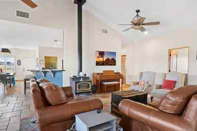 The kitchen is perfect size for large gatherings. It is equipped with premium appliances and everything you need to cook for your group. Outside we offer a BBQ, outdoor seating, and an enormous fenced in yard, that allows you to enjoy the solitude of the desert. If you decide to bring a dog, there is plenty of space for them to roam outside and enjoy the desert.