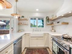 The stylish chef's kitchen features custom-designed cabinets, a farmhouse sink, and a breakfast bar. The adjacent dining room features built-in custom bench seating with plenty of extra storage.