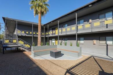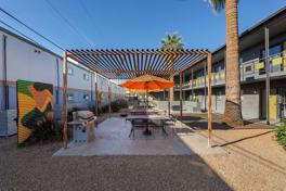 Broadway 121 is a beautifully renovated modern apartment building just off of Mill Avenue & Broadway. The location features easy access to Arizona State University, Downtown Mill Ave entertainment, and Daley Park. Broadway 121 features clean minimalist styling with exposed block accent walls, naturally finished concrete flooring, and beautiful quartz countertops in the large eat-in kitchens and bathrooms. Each unit features an in-unit stackable washer/dryer and a high efficiency (14 SEER) central HVAC system. Units are now outfitted with wall mounted 55" Smart TVs (easy to cut the cord) and electronic entry. One reserved & covered parking space per resident (we do not have guest parking on site). Common areas include mature palm trees overhanging a gazebo area with a gas bbq grill, dog stations and bike racks!