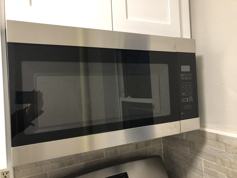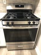 Full size stainless steel refrigerator, gas stove, microwave and dishwasher.