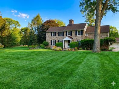 Charming 2 story Stone Colonial on Large 4 acre lot. 3 Bedroom 2 Full & 1 Half Bathroom. Random Plank Hardwood Floor throughout. Large formal living room with Oversized masonry open fireplace, (2) Windows with deep window sills and a Dutch door leading to covered slate patio shows a lovely view of property. Knotty pine paneled Dining room could also be used as a breakfast room with peek-a-boo window to kitchen. Upper level has large master bedroom & full master bath with his & hers deep closets, also has 2 good sized secondary bedrooms with deep closets a second powder room and a full hall bath. Entertain outdoors with 2 slate patios overlooking the beautiful view of the lot and wildlife. Covered front porch. Light a warm fire in the large outdoor stone fireplace on those cool fall nights. Laundry located in basement with optional laundry hook up in garage.
