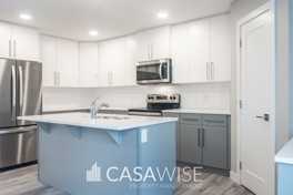 • Contemporary kitchen – Equipped with stainless steel appliances, sleek quartz countertops, a ceramic tile backsplash, and a central island ideal for meal prep, casual dining, and additional storage. Corner pantry provides extra space for organization, while modern lighting enhances the space.
