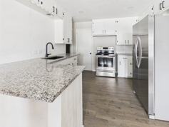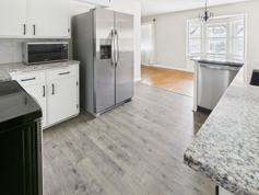 The kitchen includes granite countertops, white cabinets, and stainless appliances with good counter space and room for a dining table nearby.