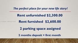2 bedroom unit, painted, lake view, pool, gym, clubhouse and children playground. Close to malls, main highways and restaurants. 2 Assigned parking lots. Unfurnished $2,300.00 Furnished $2,600.00.