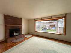 Step into a bright and welcoming living room featuring a large bay window that fills the space with natural light, along with a cozy wood stove/fireplace for added warmth and ambiance. The adjacent dining area also enjoys great light and opens to a private patio through sliding glass doors—perfect for indoor-outdoor living.