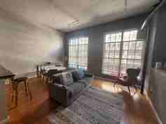 This spacious 1-bedroom, 1-bath end unit offers 1,049 square feet of open living space, high ceilings, and a distinctive industrial-modern design.