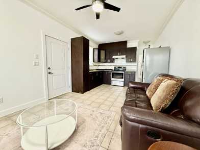 Open-concept living and kitchen space with ceiling fan, crown moulding, and excellent natural light throughout.