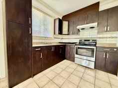 Dark-wood cabinetry with granite countertops, tile backsplash, and stainless steel appliances including fridge and stove/oven — fully equipped and ready to use.