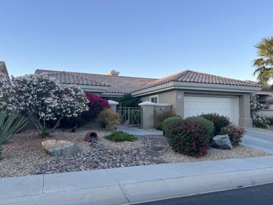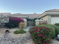 Will rent furnished/unfurnished. The Sun City Oreffors Model is ideally situated near the clubhouse and sports courts. It features a private gated courtyard, an extended patio with lush landscaping and fire pit, and a master suite with patio access, walk-in closet, and ensuite bath. The kitchen offers modern stainless appliances, connecting to the family room. Additional amenities include a separate laundry, ample storage, and a double-sided fireplace between the living and dining areas, which leads into the great room. A second bedroom and bath provide guest privacy. Sun City residents enjoy access to over 80 clubs, two championship golf courses, pools, spas, and two restaurants. Stater Brothers shopping and Legend's Restaurant are conveniently accessible by golf cart. This home is also available unfurnished.