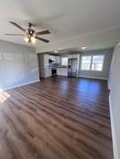 Newly remodeled home featuring stainless steel kitchen appliances, including a side-by-side refrigerator. Enjoy a clean, modern feel with no carpet throughout and bright white cabinetry. The open-concept layout offers great flow for everyday living and entertaining. A unique flex room with exposed brick adds character and versatility. The spacious bathroom and large laundry area—complete with a convenient half bath—provide added functionality. Stay comfortable with a ceiling fan in the living room. Outside, you'll find a fenced backyard and a two-bay garage perfect for a workshop or extra storage. Located in a well-established neighborhood with no HOA!