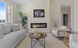 The open-concept living, dining, and kitchen area creates a welcoming and functional main space. The living room includes a sleek electric fireplace with adjustable color and heat settings, and a wall-mounted TV setup just above. The dining area features a unique chandelier with adjustable lighting and sits centrally within the space. In the kitchen, you'll find stainless steel appliances, granite counters, under-cabinet lighting, a tile backsplash, pantry, and a large island with bar seating and extra storage.