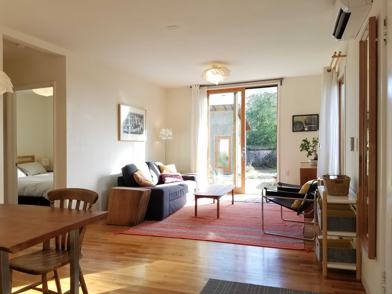 Sunny, bright, spacious, furnished apartment. Two bedrooms with studio in rear yard used as bedroom, home office, etc. Apartment opens to the south to large sunny, shared garden with picnic table, vegetable planter beds and many young fruit trees and herbs. Conveniently located in Central Berkeley, close to restaurants, cafes, parks and the Berkeley Bowl supermarket. Less than 1.5 miles to UC Berkeley, bike or bus in under 15 minutes. Bus stop direct to campus and downtown just 300 feet away. Bicycle boulevard to campus one block away.