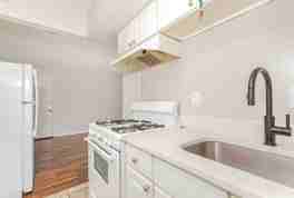 The apartment includes a bright living area with wood flooring and an open-style kitchen equipped with a refrigerator, stove, and range. Residents enjoy on-site coin laundry, controlled building access, and 24-hour emergency maintenance. Trash service is included.