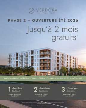Verdora est un immeuble de construction neuve située à Vaudreuil-Dorion offrant des finitions modernes et haut de gamme. Le bâtiment dispose d'une terrasse sur le toit, d'un toit vert avec vue sur l'eau, d'un lounge , d’une gym entièrement équipée et un espace coworking. Un stationnement intérieur et des casiers sont également disponibles. Disponibles immédiatement: 1-chambre à partir de 1 595$/mois 2-chambres à partir de 1 985$/mois 3-chambres à partir de 2 630$/mois PROMOTION MOIS DE MARS :JUSQU'À 2 MOIS DE LOYER GRATUIT* --------------------- Verdora is a newly constructed building in Vaudreuil-Dorion offering modern, high-end finishes. The building features a rooftop terrace, a green roof with water views, a lounge, and a fully equipped gym. Indoor parking and lockers are also available. Available for immediate occupancy: 1-bedroom starting at $1,595/month 2-bedroom starting at $1,985/month 3-bedroom starting at $2,630/month MARCH PROMOTION: UP TO TWO MONTHS OF FREE RENT*