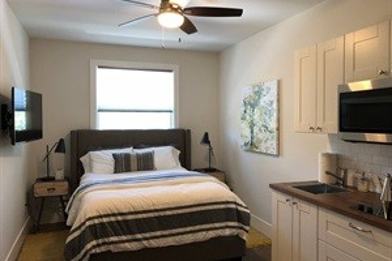 100% remodeled furnished apartment in historic iconic building in downtown San Jose at San Pedro Square. All utilities are included plus free wifi internet. Apartment has been stripped down to the studs and is totally new from floor to ceiling. Apartment interior is modern and bright, fully capable of providing a comfortable and turnkey environment for an extended stay or longer. The unit features a split system heat and air, free internet and streaming tv, kitchenette, fully equipped with stove top, refrigerator, microwave, toaster, coffee maker, all the glassware, silverware, pots, pans, cutting boards, etc...nothing has been forgotten. The apartment provides a robe, iron, towels, linens and all the basic toiletries to satisfy the perfect stay. The apartment is walking distance to dozens of food options, craft brewery's, coffee shops and markets. The convention center, SAP event center and train and bus lines is less than a 10 minute walk. There is paid public parking in a secure structure across the street. The parking is maintained and provided by the City of San Jose. Parking is $125 per month to be verified and purchased directly by the tenant. The unit comes with a full size range with mini portable oven.