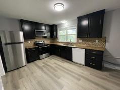 Kitchen cabinets repainted, featuring quartz countertops, newer appliances and lighting