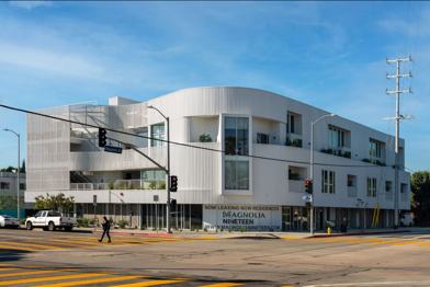 Centered around a light-filled courtyard, Magnolia Nineteen is interconnected by a series of landscaped pathways that lead to a rooftop Zen garden. Each home enjoys ample daylight, natural ventilation, and private open spaces with sweeping views of the Santa Monica Mountains and the surrounding natural landscape, including century-old oak and cedar trees. The thoughtful arrangement of exterior screens and panels that wrap the building with engaging curvature presents a constantly changing exterior visual by playing off the natural reflection and glow of sunlight.