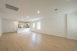 A floor plan with a smart layout. The front door leads to an open-concept living area ideal for daily activities and entertaining guests with a modern kitchen, dining room, and family room, all side by side. Two bedrooms share a hall bathroom at the front of the home, while the owner’s suite is tucked into the back with a private bathroom and a large walk-in closet.