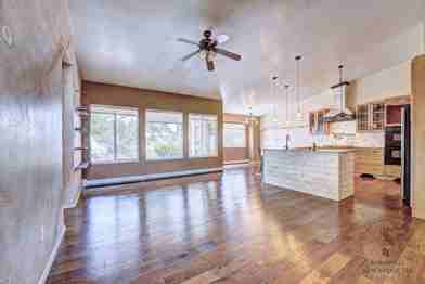 The home features hardwood floors and custom-painted walls that create a warm, inviting atmosphere. The open-concept layout connects the spacious kitchen, dining area, and living room, making it functional for both daily living and entertaining. The kitchen offers ample space for meal preparation and flows naturally into the main living areas. Natural light enhances the interior, and the layout provides flexibility for a home office or additional living space.