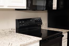•Full Kitchen: Cook in style with sleek granite countertops and all-black appliances, including a refrigerator,