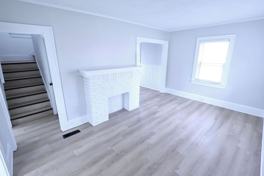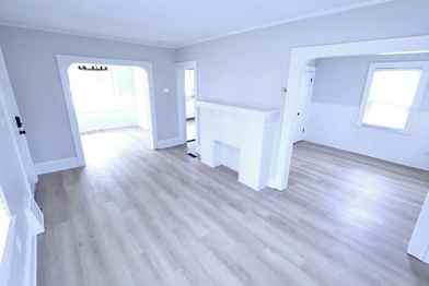 The main living area offers a spacious, open feel with updated flooring, neutral tones, and a charming decorative fireplace that adds character. Arched entryways and detailed trim provide a classic touch while maintaining a clean, modern look.
