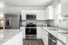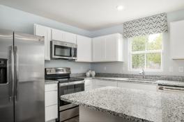 - Light‑filled kitchen with white cabinets and quartz countertops