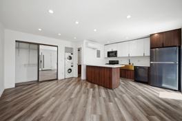 Carefully restored and designed by a renowned LA designer, these 1960s modern luxury rental homes feature keyless entry door locks to spacious two-bedroom floor plans with newly renovated kitchen and bathrooms. The kitchen boasts sparkling white stone quartz countertops with brand new self closing cabinetry and high-end stainless-steel refrigerators with matching gas cooktop with oven and microwave. Stacked washer and dryers included inside each rental home with porcelain tiled bath tubs and glass shower doors. Each rental home also includes central A/C cooling and heating with recessed lights with luxury style cellular shade window blinds and distressed wood plank floors.