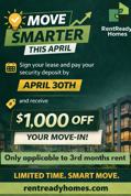 PROMO: Sign Your Lease And Pay Your Security Deposit By April 30th and Receive $1000 off your move in!