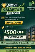 PROMOTION: Pay your deposit by April 30th, Receive $500 off your 3rd month
