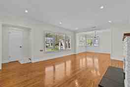 Inside, the home features beautiful wood flooring, vaulted ceilings, and an open, airy layout that enhances the sense of space throughout. Elegant wainscoting details add warmth and architectural character to the living areas. The fully remodeled kitchen is a standout feature, showcasing quartz countertops, a farmhouse-style sink, soft-close cabinetry, and modern finishes that blend both style and functionality.