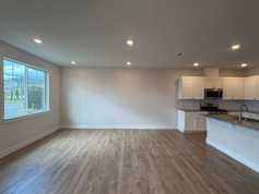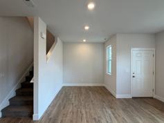 * Living room features a high ceiling, hardwood flooring, recessed lighting, and large windows overlooking the front of the home's front yard