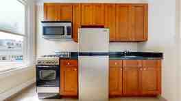 This 280 sq. ft. apartment in San Francisco's Hayes Valley neighborhood offers a thoughtful layout that maximizes every inch of space. The modern kitchen is equipped with stainless steel appliances, including a gas range, refrigerator, and built-in microwave. Warm wood cabinetry contrasts beautifully with the sleek black countertops, creating a functional and aesthetically pleasing culinary space.